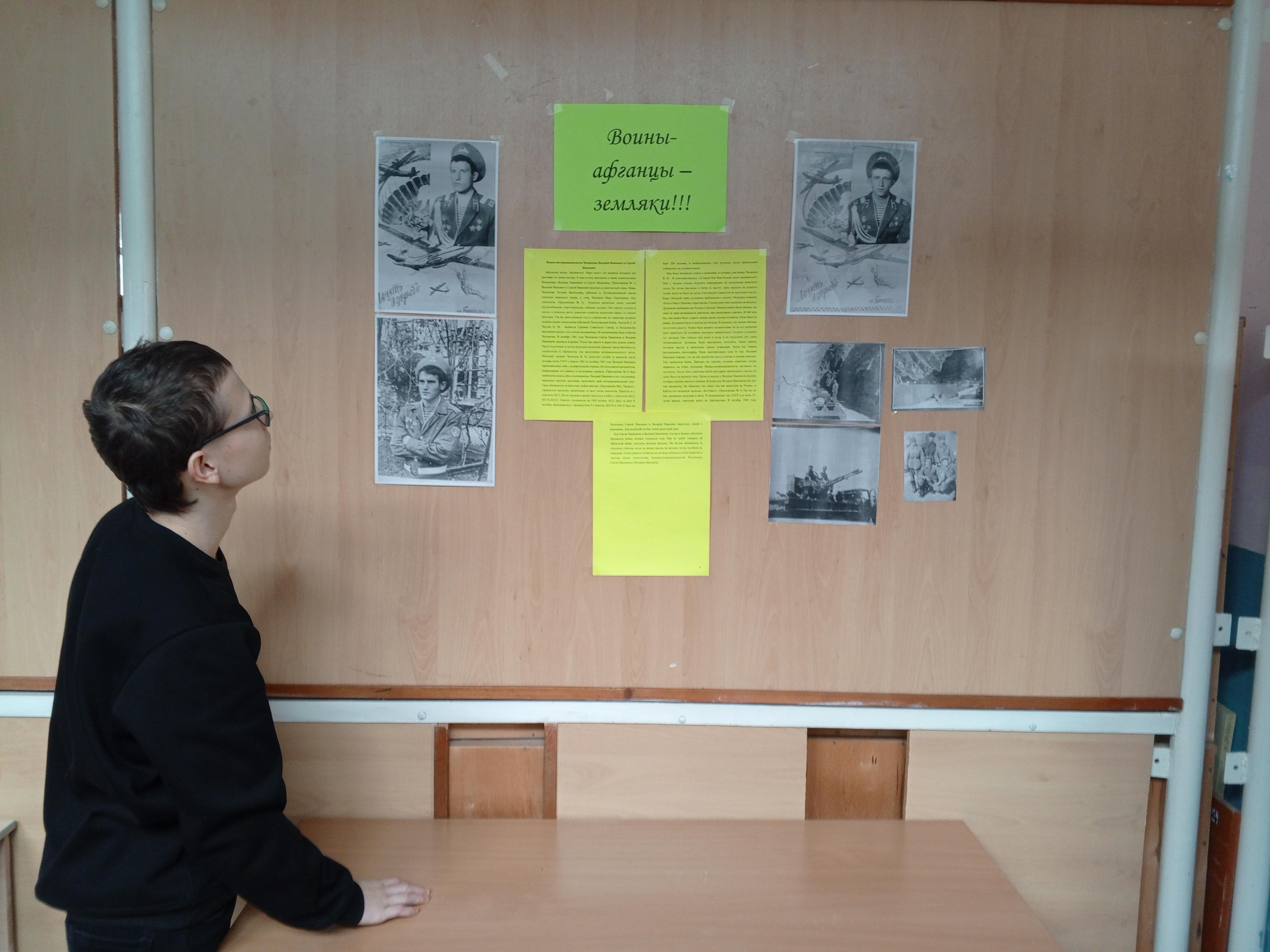 15 февраля - День памяти о россиянах, исполнявших служебный долг за пределами Отечества. Именно в этот день, 15 февраля 1989 года — завершился вывод советских войск из Афганистана, в соответствии с заключёнными 14 апреля 1988 года Женевскими соглашениями. Последняя колонна советских войск покинула территорию Афганистана. Мы гордимся всеми, кто, храня верность присяге, с честью исполнил воинский долг в "горячих точках" и скорбим о тех, кто пал в бою смертью храбрых. На классных часах мы вспомнили о героизме и самоотверженности наших земляков воинов-интернационалистов. Важно помнить, какой ценой доставался мир, и чтить память тех, кто прошел через Афганистан.