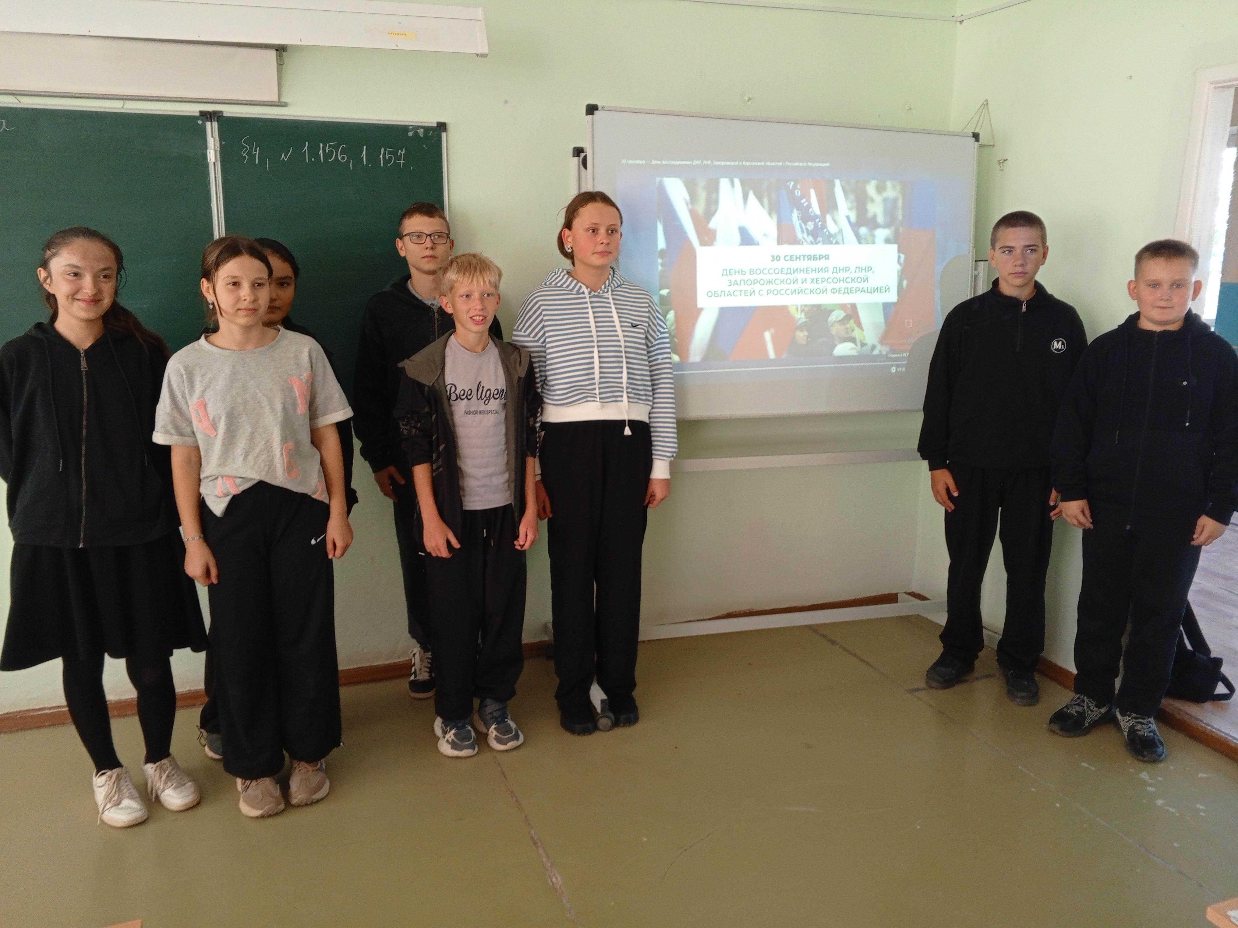 30 сентября в России отмечают День воссоединения Донецкой и Луганской народных республик, Запорожской и Херсонской областей с Российской Федерацией. Этот день отмечают с 2023 года. С тех пор он стал символом исторической справедливости и единства русского народа. В МКОУ "Луговопролейская СШ" прошли классные часы "Донбасс - сердце России".