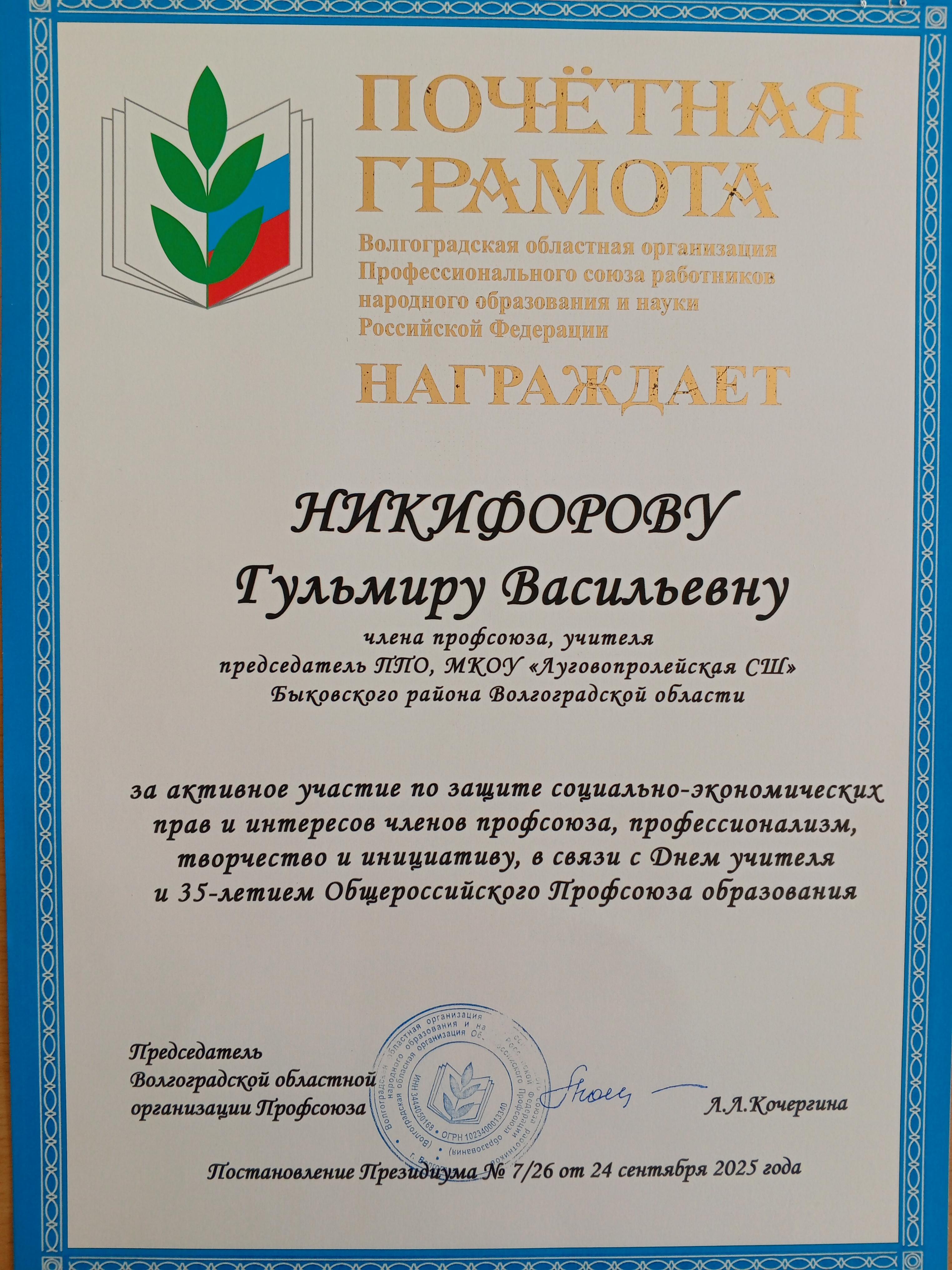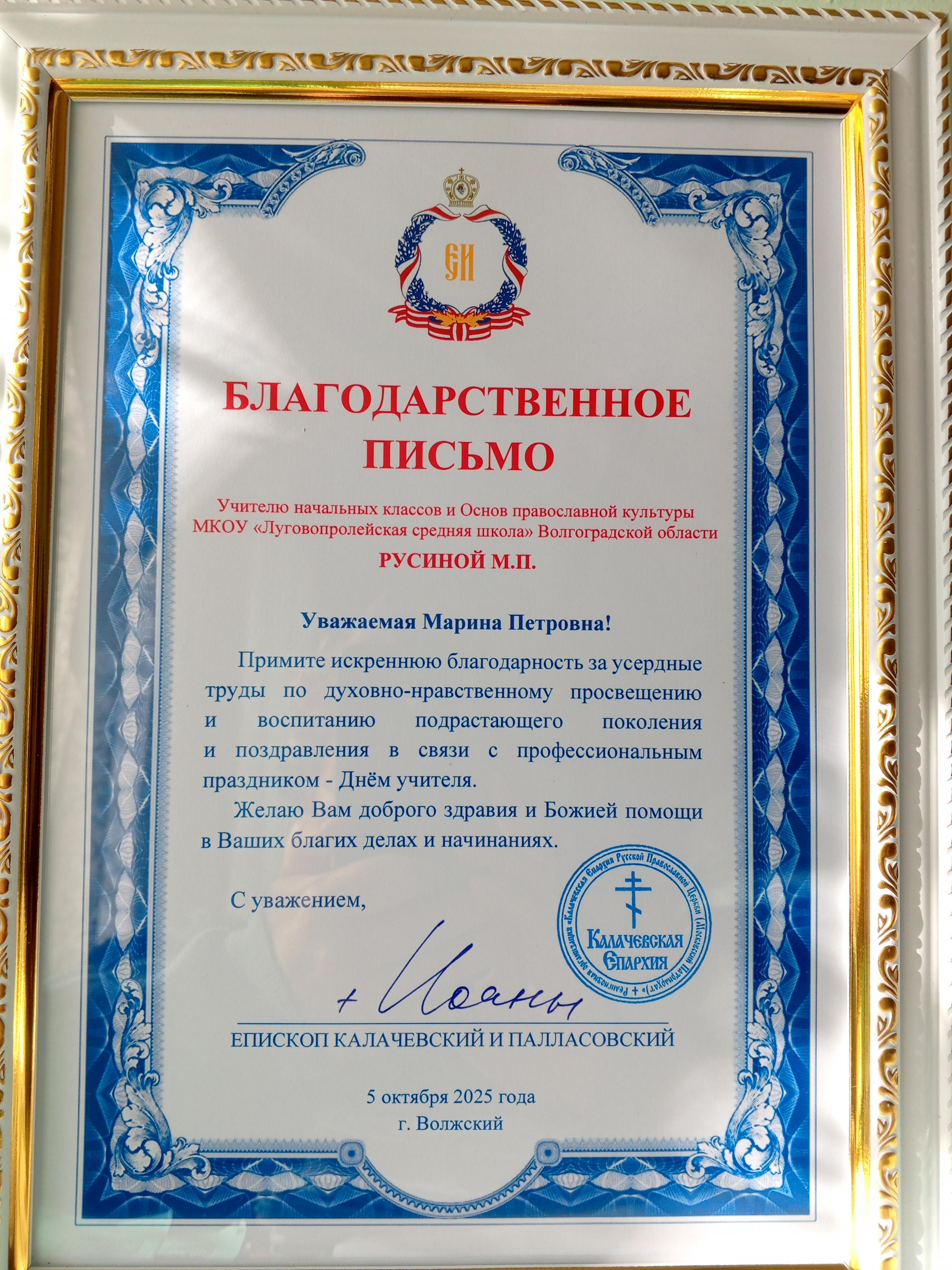 10.10.2025 в МБУК ЦКД прошел праздничный концерт, посвященный дню учителя и дошкольного работника. Учитель начальных классов и основ православной культуры Русина М.П. награждена благодарственным письмом епископа Калачевской епархии. Председатель ППО, учитель Никифорова Г.В. награждена Почетной грамотой Волгоградской областной организации Профессионального союза работников народного образования и науки Российской Федерации. 13.10.2025 на торжественной линейке в МКОУ "Луговопролейская СШ" и.о.директора Жемуханов В.И. вручил учителю Русиной М.П. благодарственное письмо епископа Калачевской епархии и учителю Никифоровой Г.В. Почетную грамоту Волгоградской областной организации Профессионального союза работников народного образования и науки Российской Федерации и пожелал дальнейших успехов в деле воспитания подрастающего поколения.